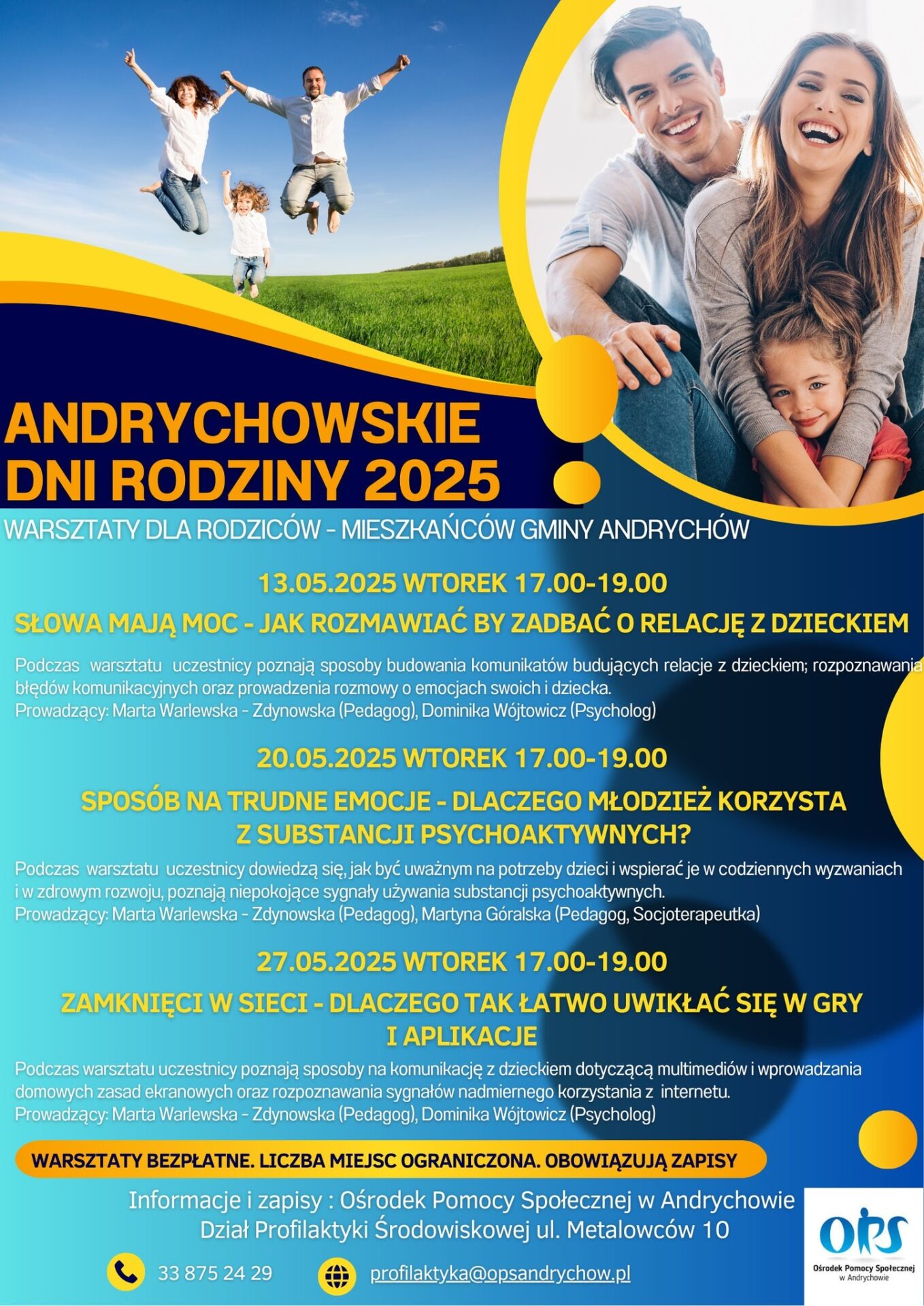 Zapisy – telefonicznie (tel. 33 875 24 29) lub osobiście w budynku Działu Profilaktyki Środowiskowej Ośrodka Pomocy Społecznej w Andrychowie przy ul. Metalowców 10.