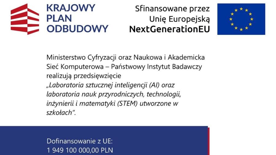 Minister Cyfryzacji oraz Naukowa i Akademicka Sieć Komputerowa – Państwowy Instytut Badawczy realizują przedsięwzięcie finansowane ze środków Krajowego Planu Odbudowy i Zwiększania Odporności: Laboratoria sztucznej inteligencji (AI) oraz laboratoria nauk przyrodniczych, technologii, inżynierii i matematyki (STEM) utworzone w szkołach” dla inwestycji C2.2.1 „Wyposażenie szkół / instytucji w odpowiednie urządzenia i infrastrukturę ICT w celu poprawy ogólnej wydajności systemów edukacji” w ramach Komponentu C „Transformacja cyfrowa”.