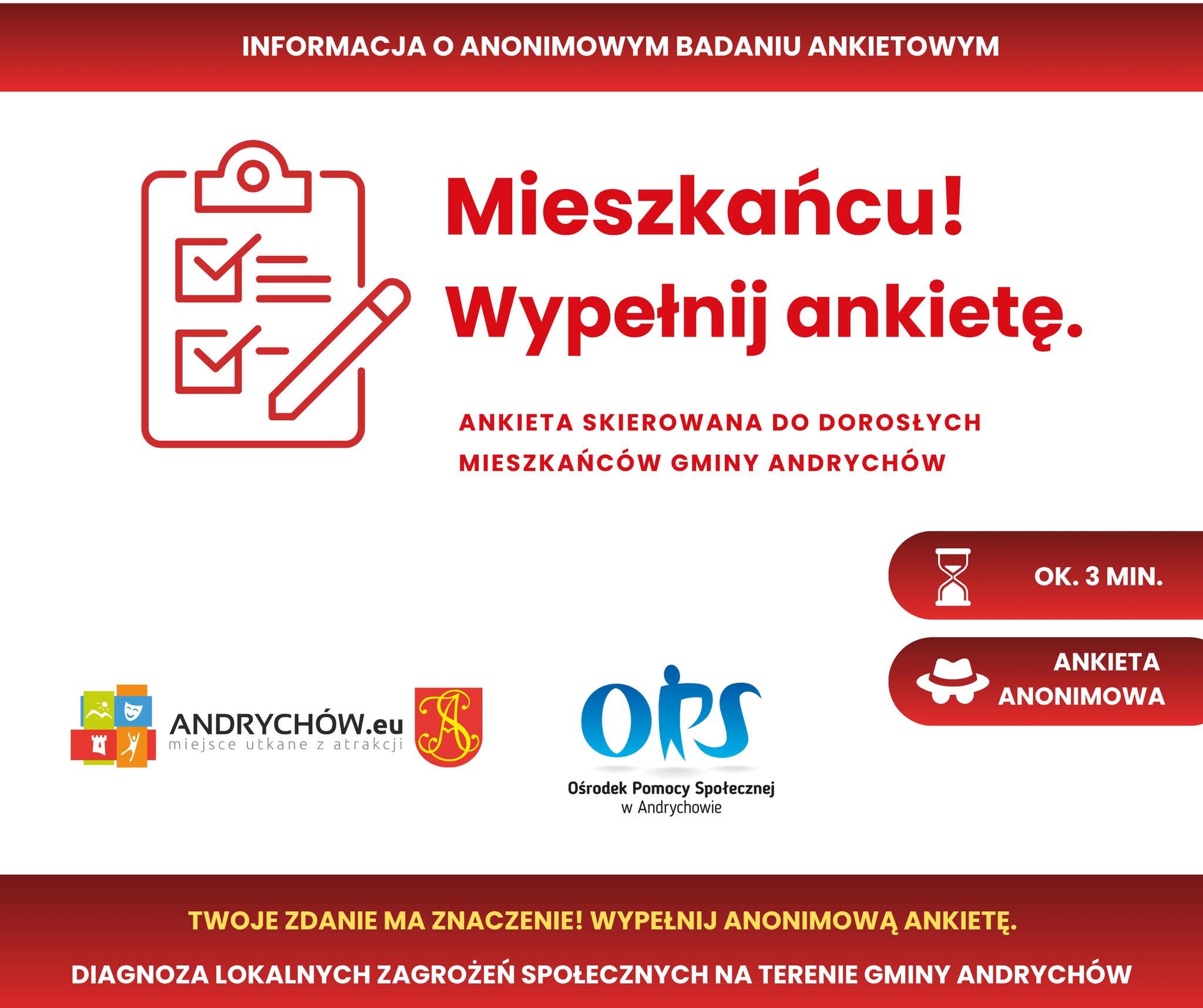 Ankieta jest skierowana do Dorosłych Mieszkańców Gminy Andrychów i ma na celu właściwe zdiagnozowanie problemów społecznych występujących w naszym lokalnym środowisku.