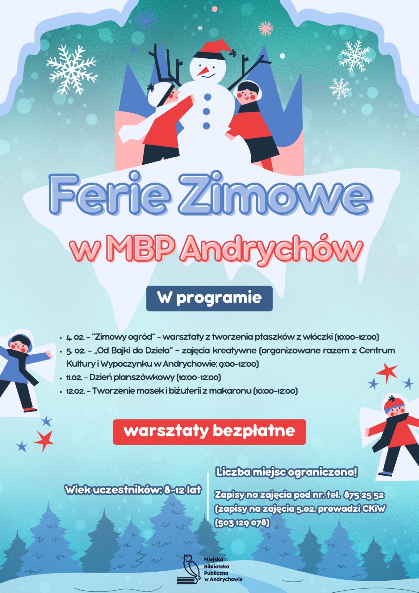 Udział w zajęciach jest bezpłatny, liczba miejsc ograniczona – decyduje kolejność zgłoszeń. Zapisów można dokonać telefonicznie pod numerem 33 875 25 52 (Uwaga! Zapisy na zajęcia 5 lutego prowadzi Centrum Kultury i Wypoczynku w Andrychowie, nr tel. 503 129 078).