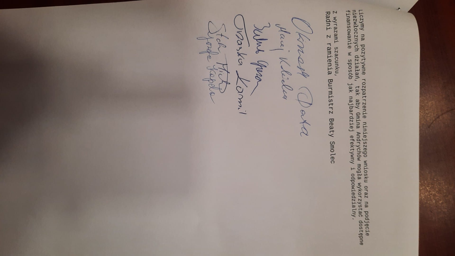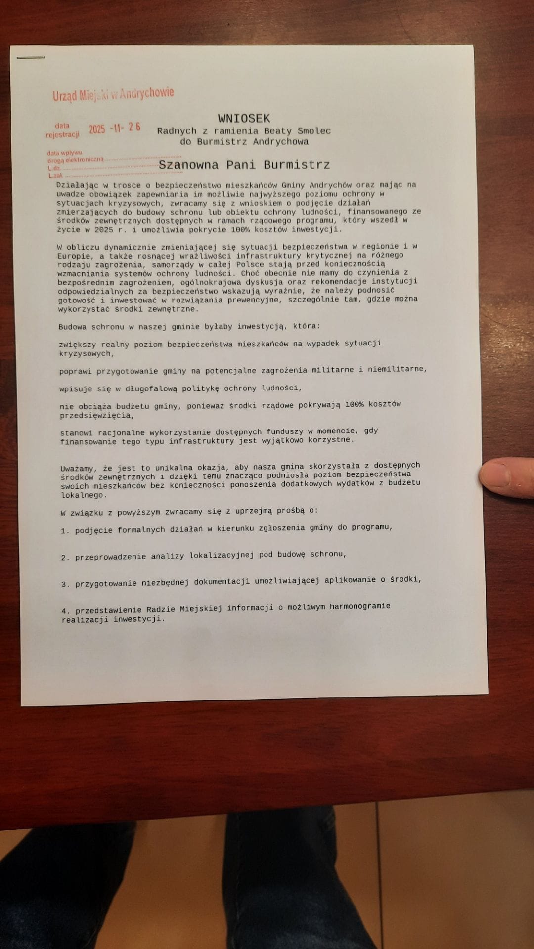 Obok Doroty Okrzesik radni: Maciej Kobielus, Jakub Guzdek, Kamil Trzaska, Michał Stokłosa i Józefa Kapela napisali m.in.: Działając w trosce o bezpieczeństwo mieszkańców Gminy Andrychów oraz mając na uwadze obowiązek zapewnienia im możliwie najwyższego poziomu ochrony w sytuacjach kryzysowych, zwracamy się z wnioskiem o podjęcie działań zmierzających do budowy schronu lub obiektu ochrony ludności, finansowanego ze środków zewnętrznych dostępnych w ramach rządowego programu, który wszedł w życie w 2025 r. i umożliwia pokrycie 100% kosztów inwestycji.