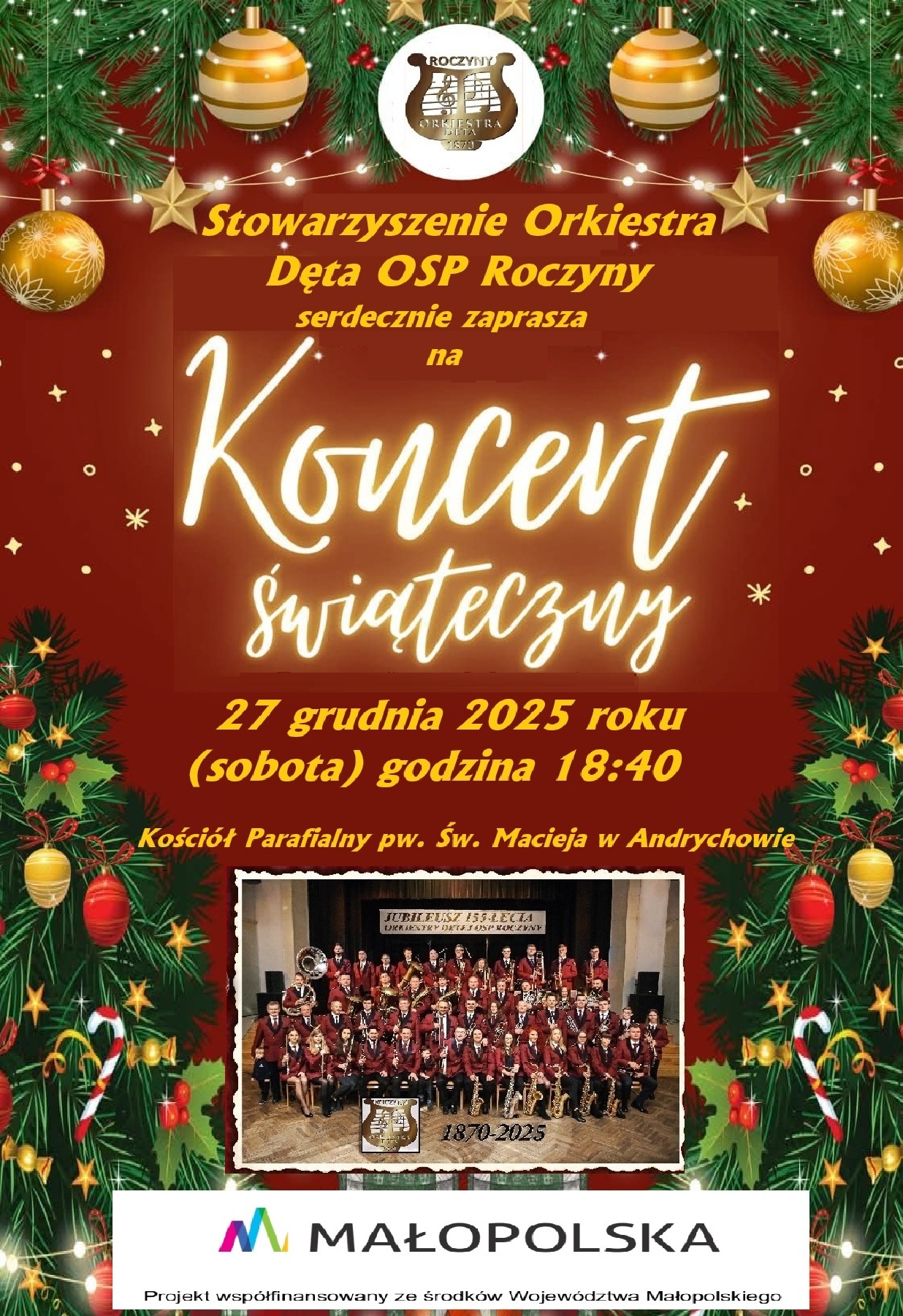 Wystąpi blisko 50 muzyków Orkiestry Dętej OSP w Roczynach wraz z wokalistką Izabelą Bąk. Publiczność usłyszy specjalnie przygotowany, jubileuszowy repertuar kolęd, pastorałek i utworów świątecznych w niepowtarzalnych aranżacjach, inspirowanych m.in. twórczością zespołów Golec uOrkiestra, Armia Janosika oraz muzyką góralską.