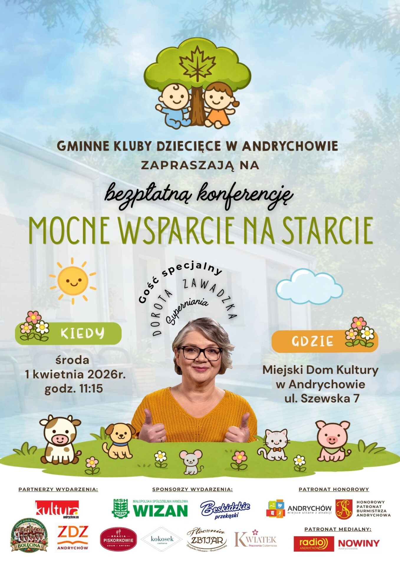 Zapraszamy rodziców, nauczycieli, opiekunów i wszystkich zainteresowanych rozwojem dziecka w wieku do lat 3 na konferencję z okazji uroczystego otwarcia Gminnych Klubów Dziecięcych w Andrychowie – informuje Pani Dyrektor. Konferencja odbędzie się 1 kwietnia 2026 r. w Miejskim Domu Kultury przy ul. Szewskiej 7.