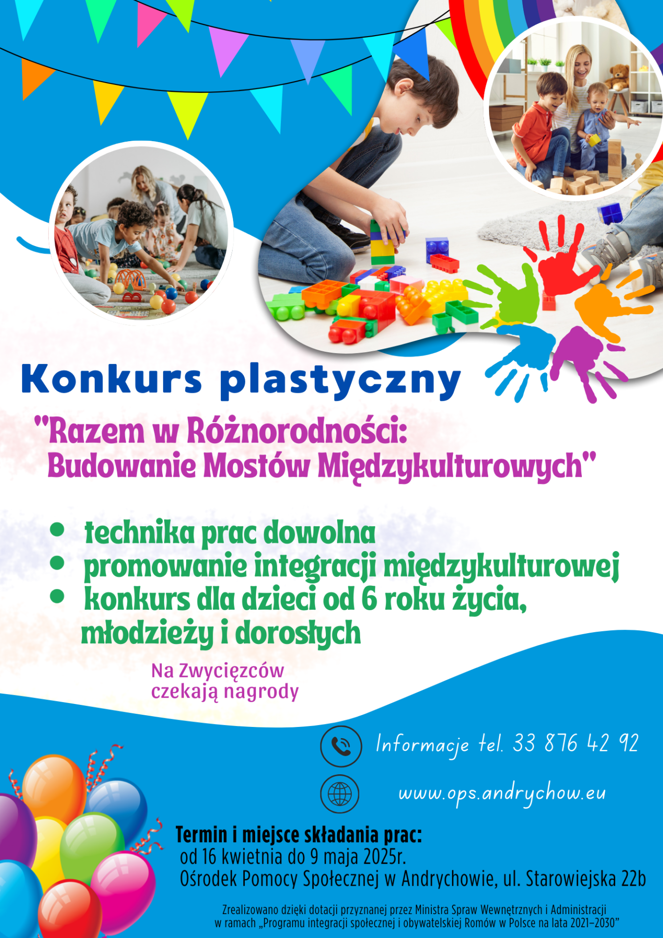 Andrychowski OPS zachęca do udziału w konkursie plastycznym "Razem w Różnorodności: Budowanie Mostów Międzykulturowych". Celem konkursu jest promowanie integracji międzykulturowej poprzez sztukę.