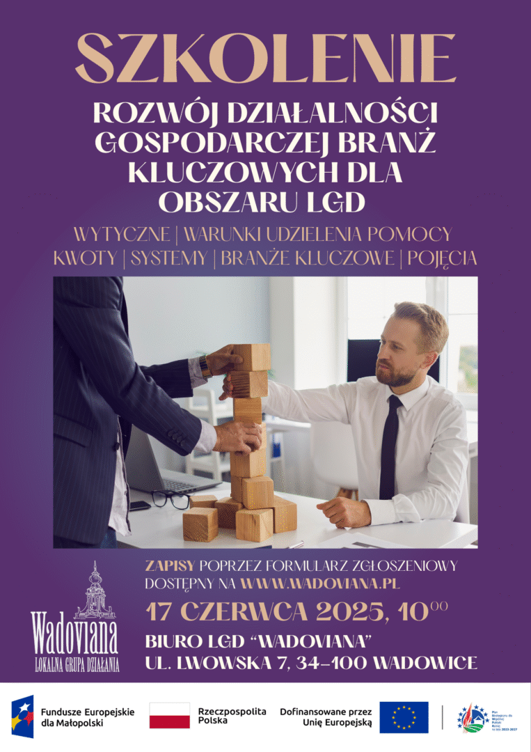 Ponadto, w związku z planowanymi naborami w 2025 roku na Rozwój działalności gospodarczej branż kluczowych dla obszaru LGD zapraszamy na szkolenie, które odbędzie się w dn. 17.06.2025 o godzinie 10:00 w Biurze LGD „Wadoviana” (ul. Lwowska 7, 34-100 Wadowice) – wejście od strony ul. Wojtyłów.