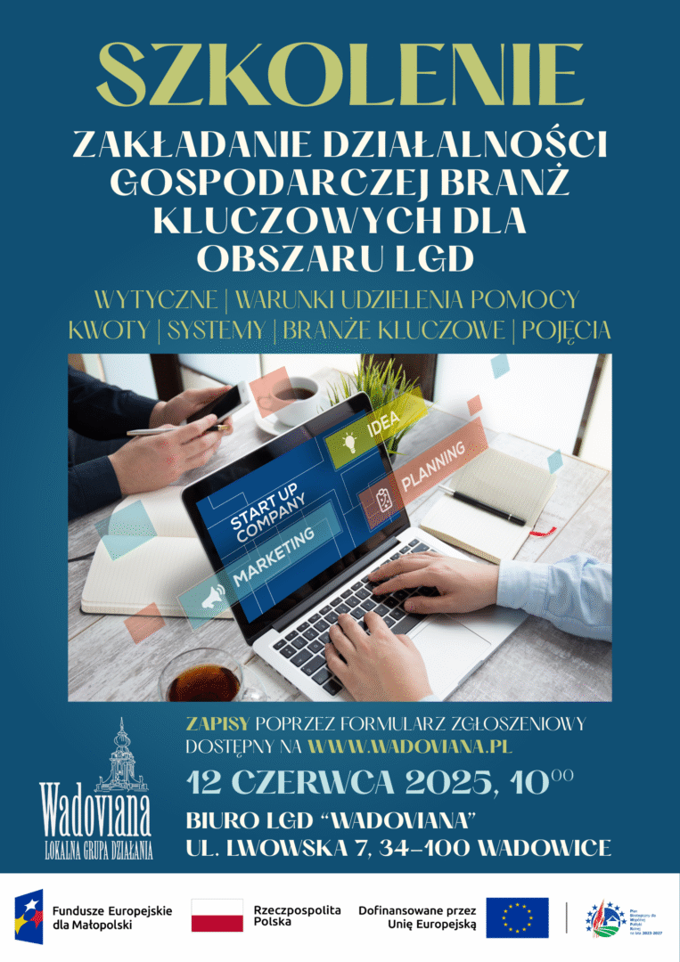 W związku z planowanymi naborami w 2025 roku na Zakładanie działalności gospodarczej branż kluczowych dla obszaru LGD zapraszamy na szkolenie, które odbędzie się w dn. 12.06.2025 o godzinie 10:00 w Biurze LGD „Wadoviana” (ul. Lwowska 7, 34-100 Wadowice) – wejście od strony ul. Wojtyłów.