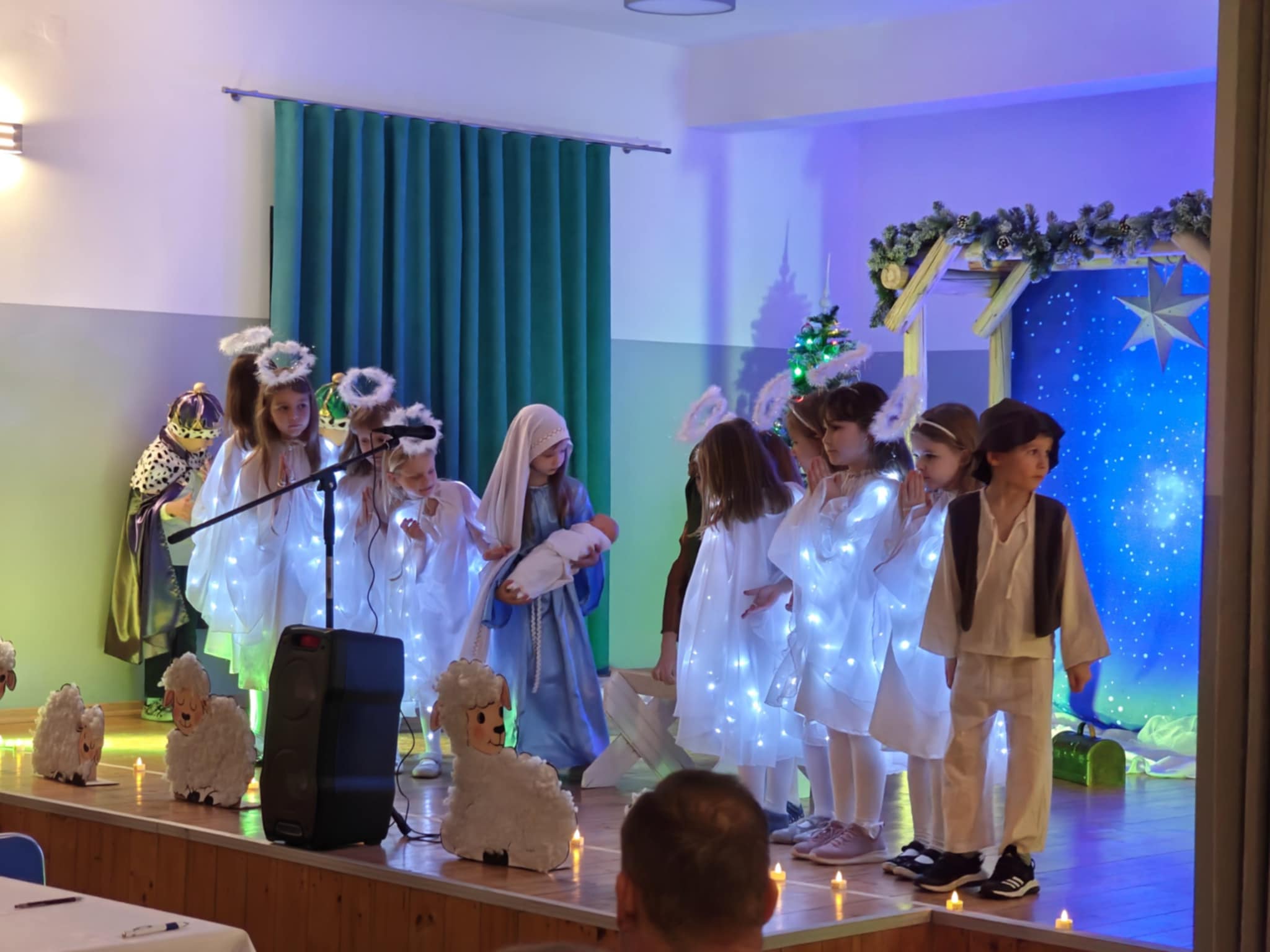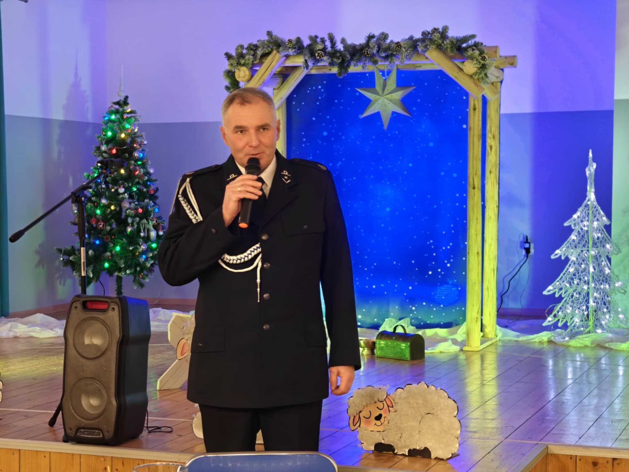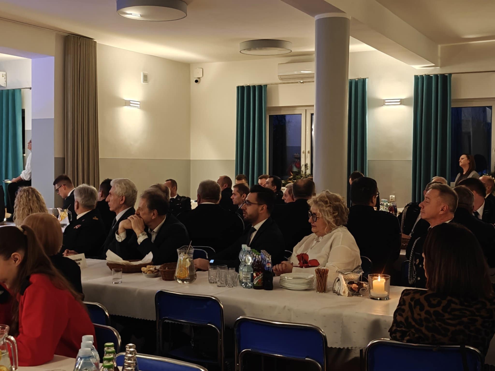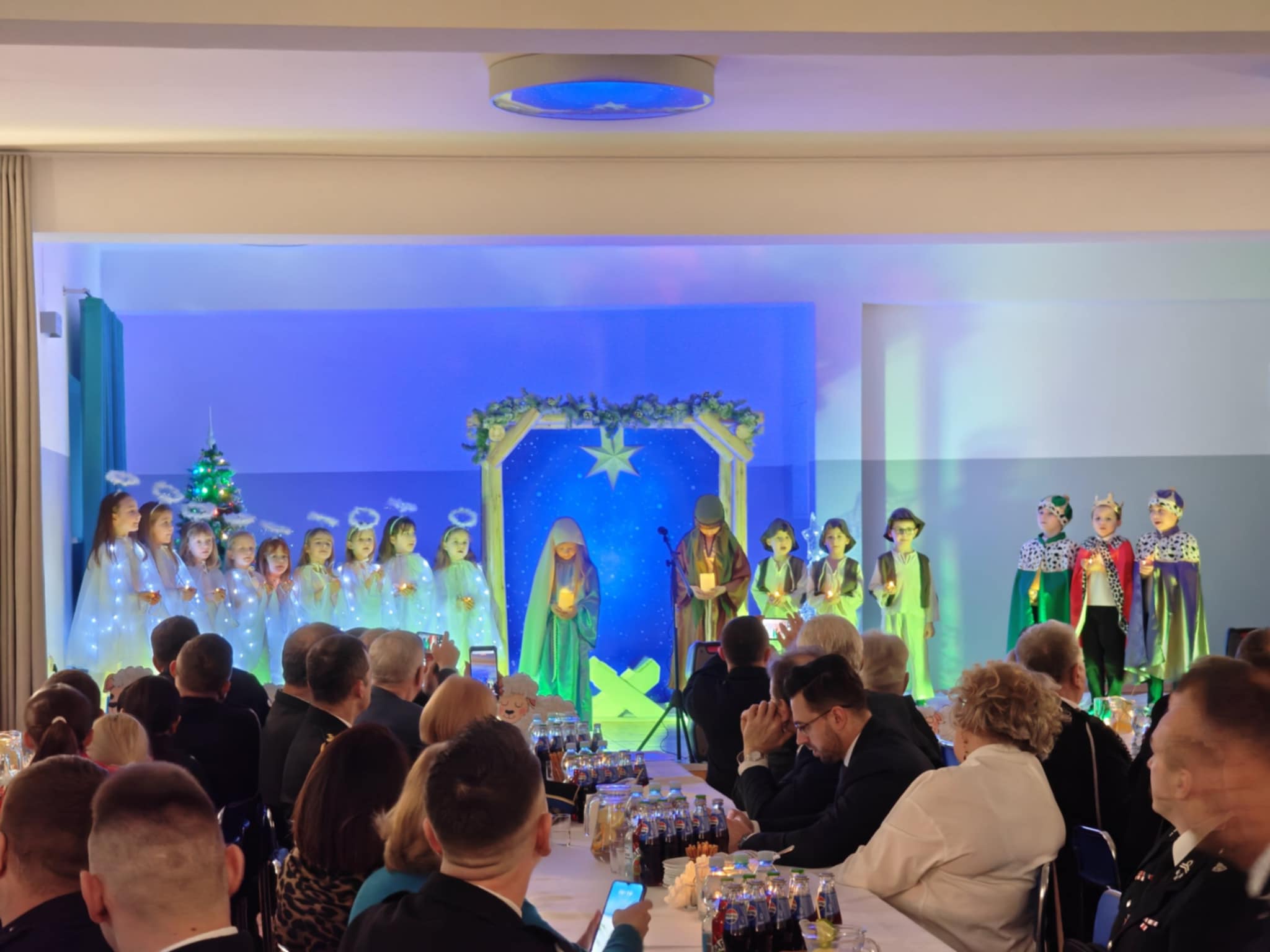 Po krótkim wstępie, powitaniu gości i modlitwie prowadzonej przez proboszcza parafii w Sułkowicach-Łęgu, księdza Stanisława Skrzypca zebrani mieli możliwość obejrzenia krótkiego spektaklu jasełkowego. W przedstawieniu wystąpiły przedszkolaki z Publicznej Szkoły Podstawowej SPSK im. św. Antoniego z Padwy w Brzezince. W trakcie spektaklu część przedstawicieli OSP Andrychów musiała opuścić salę, ponieważ zostali wezwani do wyjazdu alarmowego. To pokazało, że strażak jest na służbie nawet podczas „branżowych” spotkań opłatkowych.