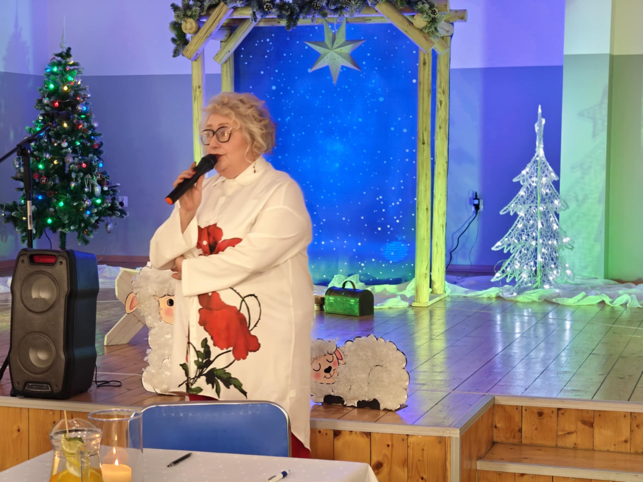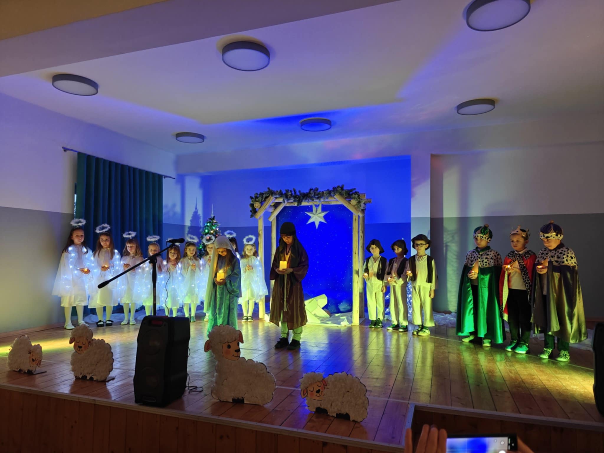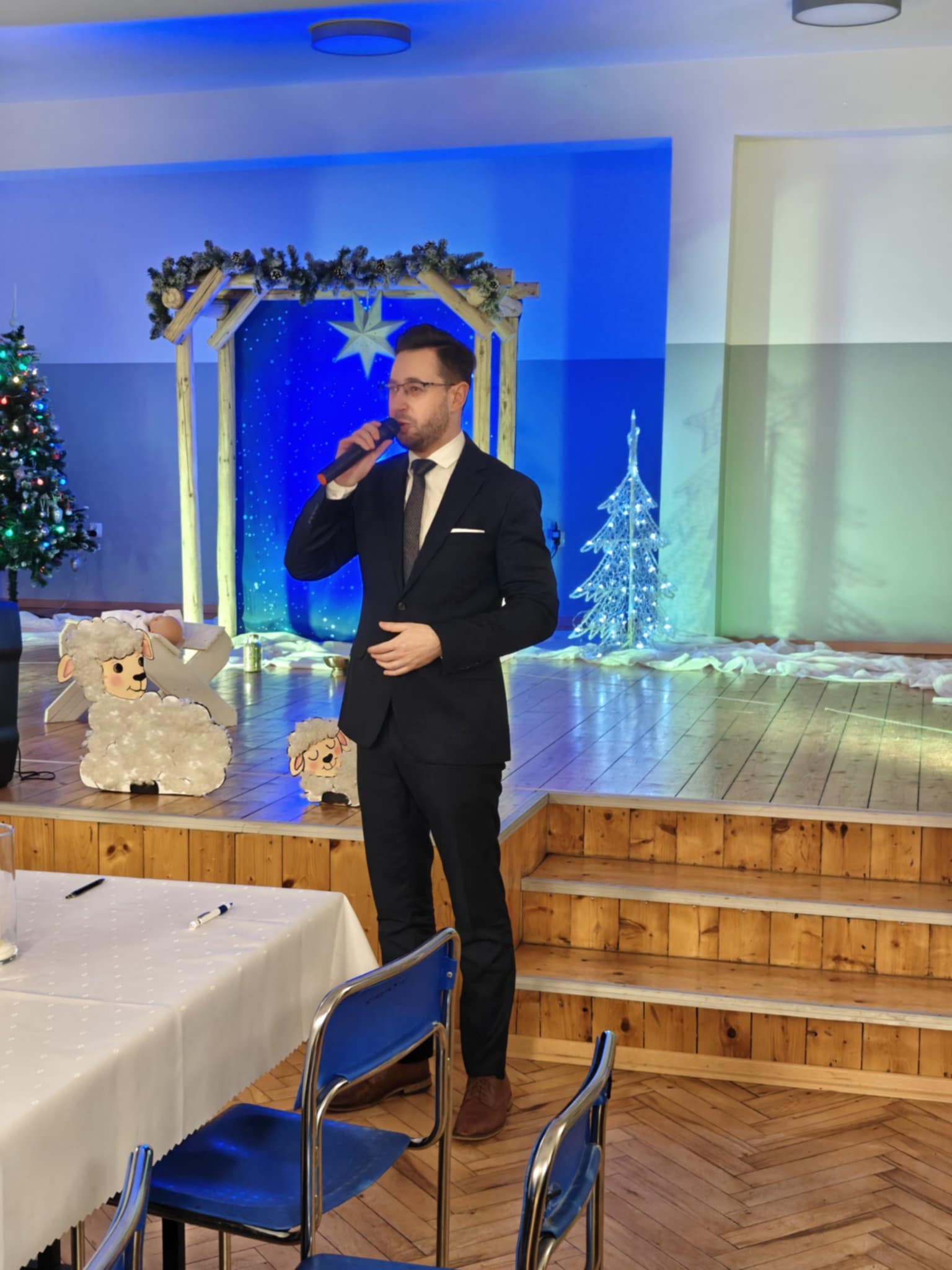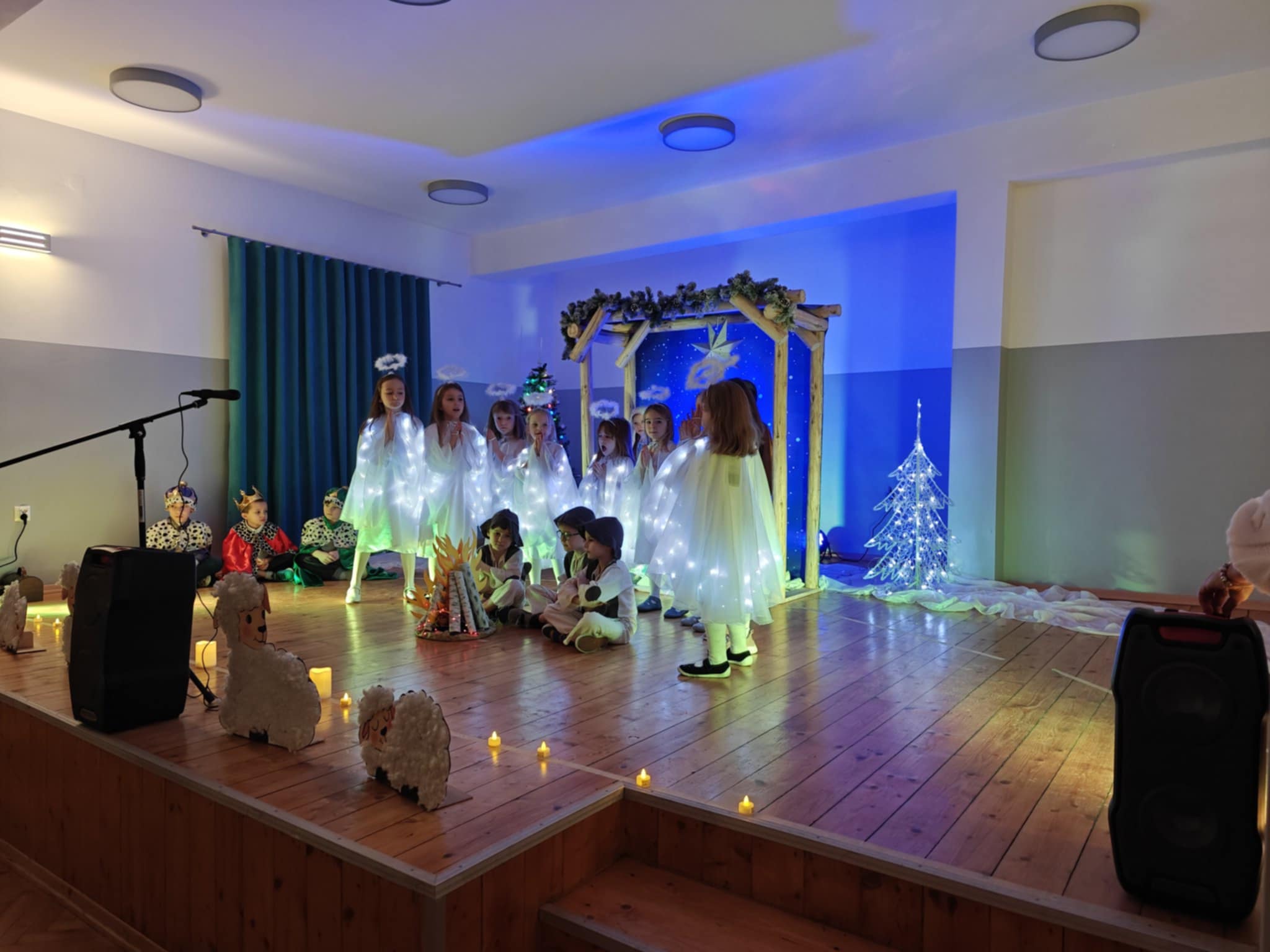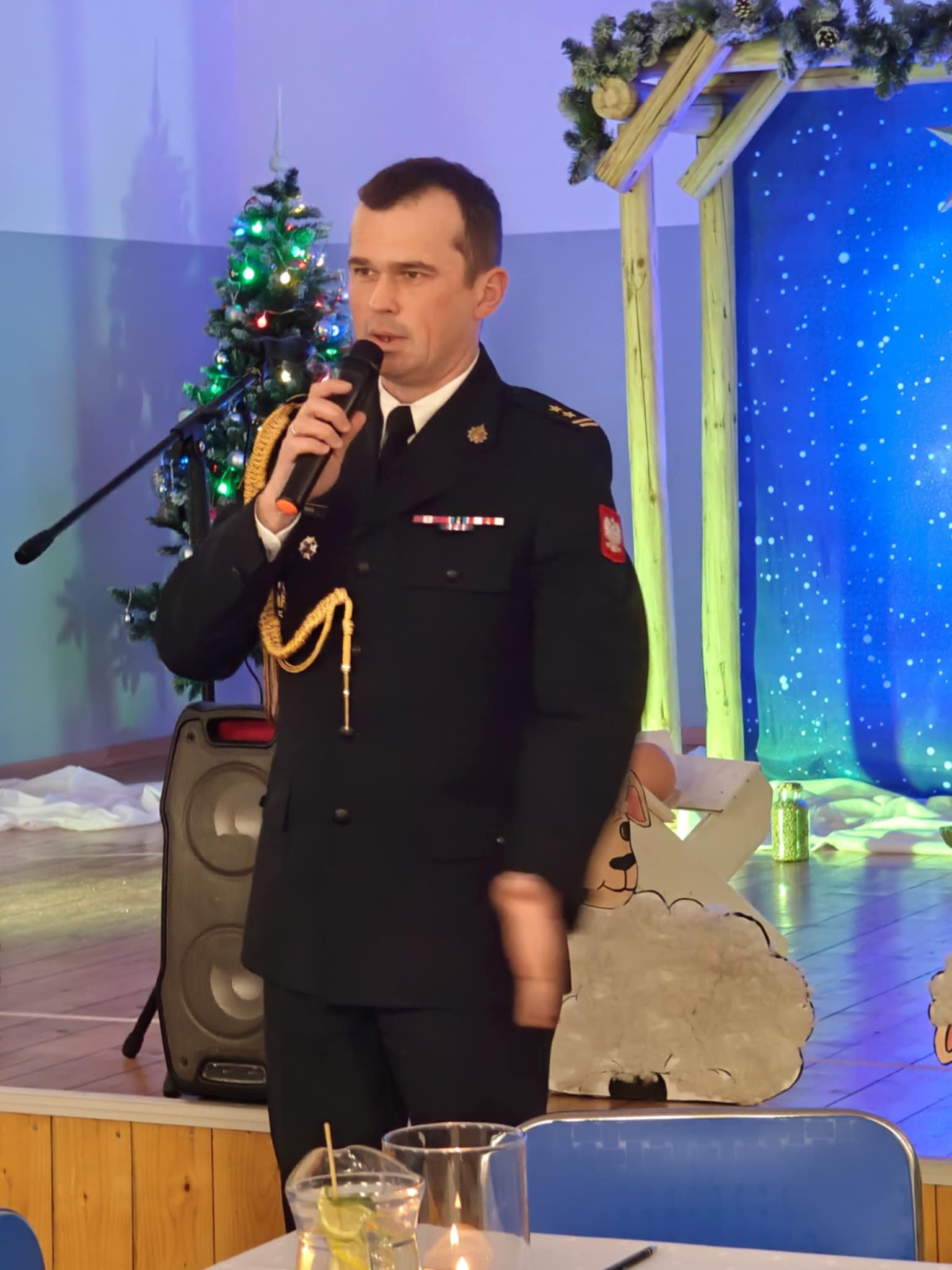 Po krótkim wstępie, powitaniu gości i modlitwie prowadzonej przez proboszcza parafii w Sułkowicach-Łęgu, księdza Stanisława Skrzypca zebrani mieli możliwość obejrzenia krótkiego spektaklu jasełkowego. W przedstawieniu wystąpiły przedszkolaki z Publicznej Szkoły Podstawowej SPSK im. św. Antoniego z Padwy w Brzezince. W trakcie spektaklu część przedstawicieli OSP Andrychów musiała opuścić salę, ponieważ zostali wezwani do wyjazdu alarmowego. To pokazało, że strażak jest na służbie nawet podczas „branżowych” spotkań opłatkowych.