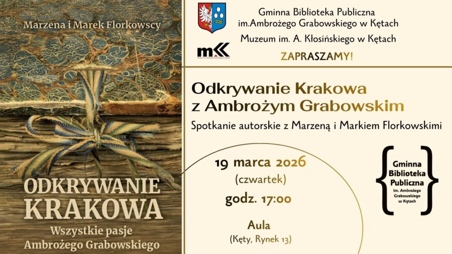 Gminna Biblioteka Publiczna w Kętach zaprasza miłośników historii i nie tylko na "Odkrywanie Krakowa z Ambrożym Grabowskim". Spotkanie autorskie z Marzeną i Markiem Florkowskimi, połączone z promocją książki „Odkrywanie Krakowa. Wszystkie pasje Ambrożego Grabowskiego”.