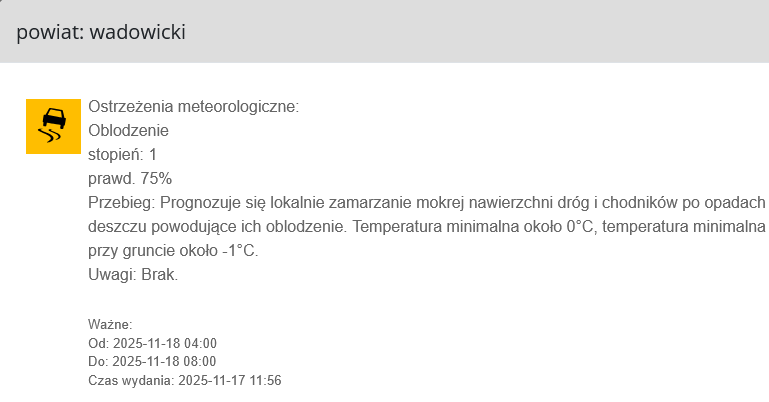 Synoptycy prognozują zamarzanie mokrej nawierzchni dróg i chodników po opadach deszczu, które w ciągu nocy przejdą w deszcz ze śniegiem oraz mokry śnieg. Warunki te mogą prowadzić do śliskiej i niebezpiecznej nawierzchni.