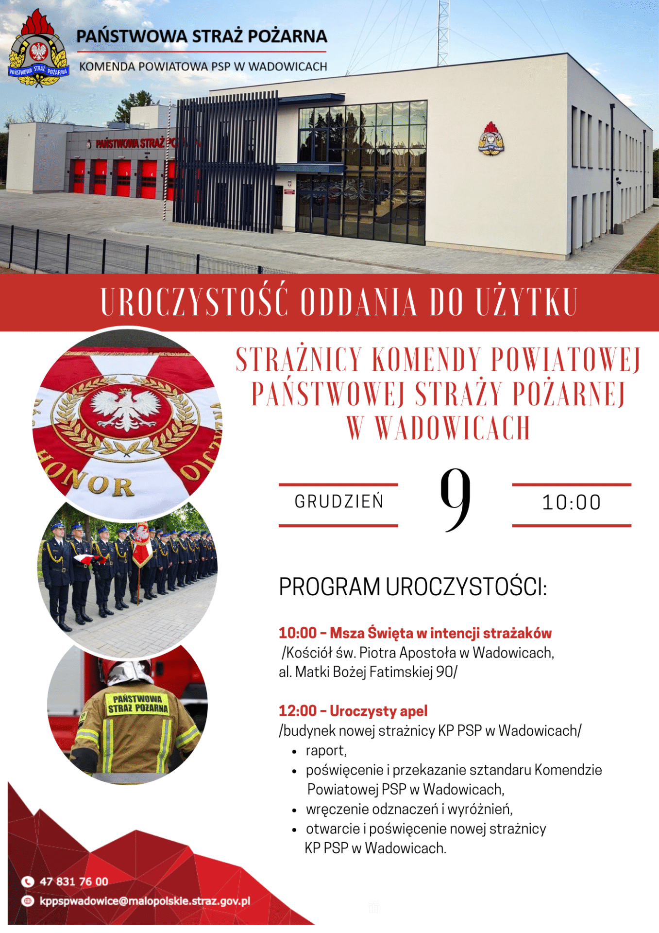 Kolejnym punktem uroczystości będzie pożegnanie dotychczas obowiązujących sztandarów JRG PSP w Wadowicach i Andrychowie, a następnie odczytanie aktu ufundowania i nadania nowego sztandaru Komendzie Powiatowej Państwowej Straży Pożarnej w Wadowicach.