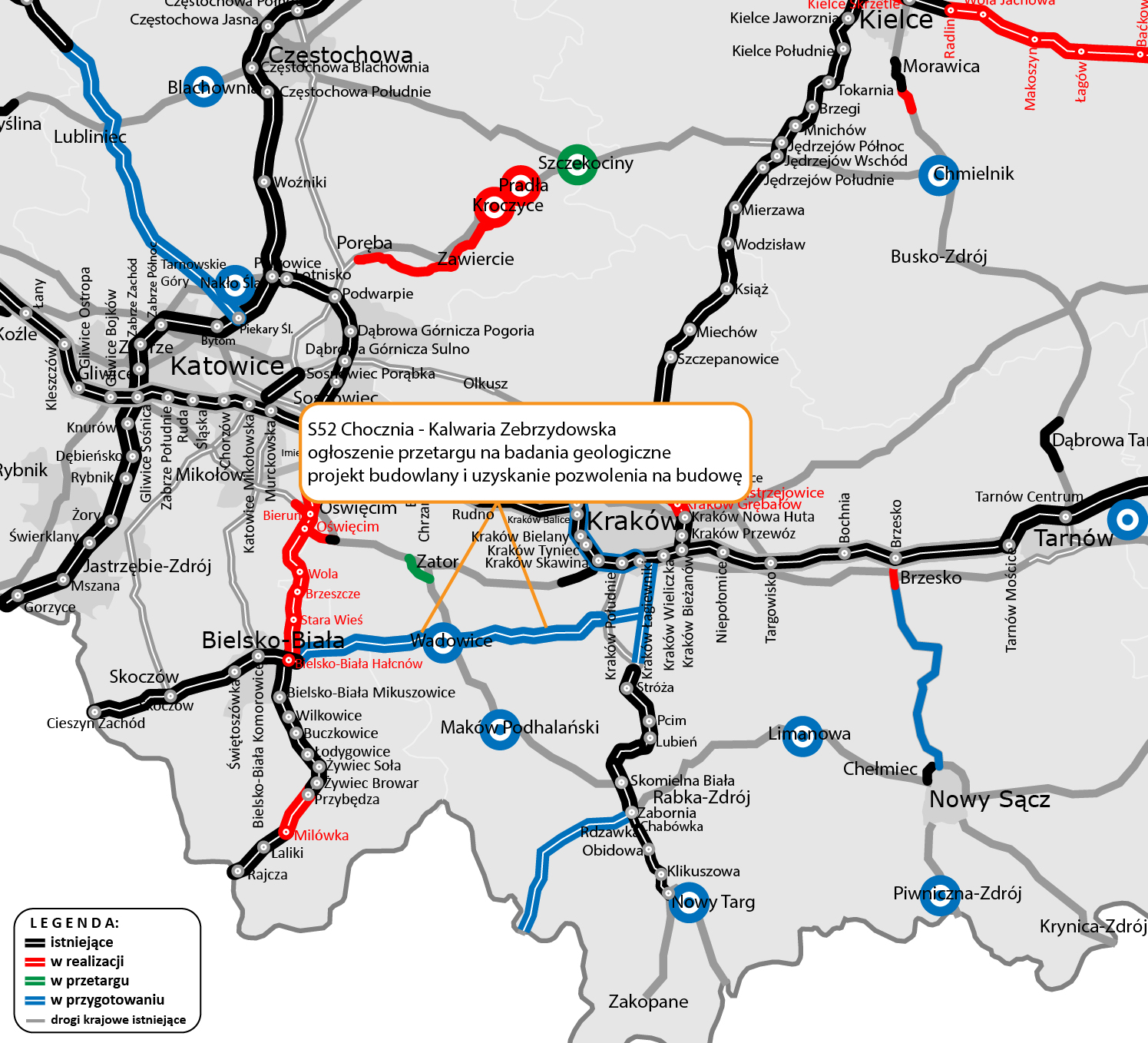 „Ogłosiliśmy przetarg na przeprowadzenie badań geologicznych, przygotowanie projektu budowlanego i uzyskanie pozwolenia na budowę dla kolejnego odcinka Beskidzkiej Drogi Integracyjnej. To 20 km drogi ekspresowej S52 między przyszłymi węzłami Chocznia i Kalwaria Zebrzydowska Wschód. Na oferty czekamy do 25 lutego br. „