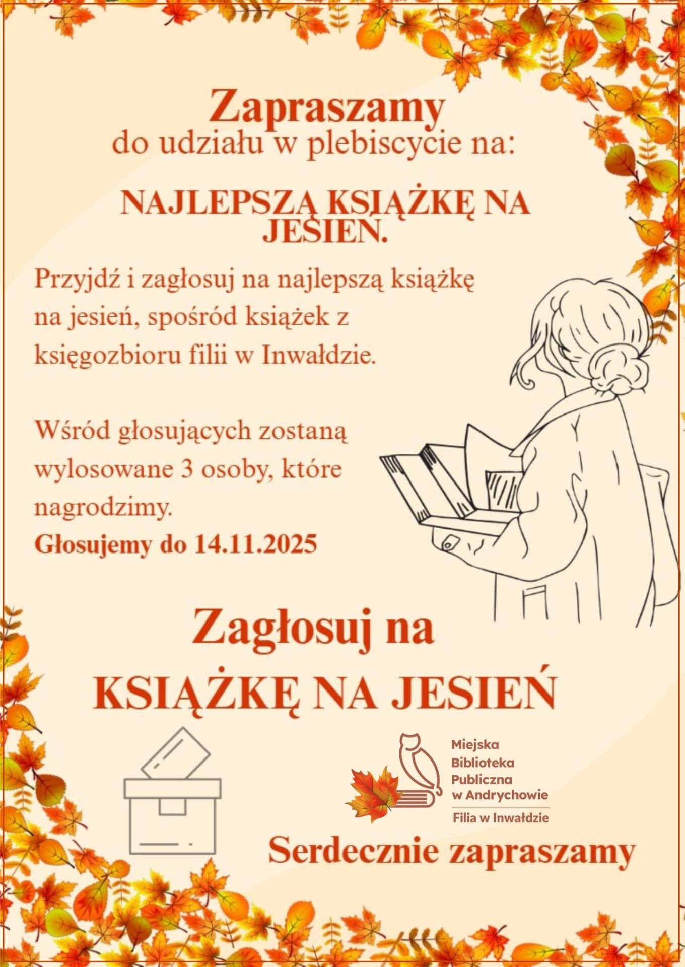 Aby wziąć udział w plebiscycie, wystarczy odwiedzić bibliotekę w Inwałdzie i oddać głos na wybraną książkę z lokalnego księgozbioru. Głosowanie potrwa do 14 listopada. Wśród uczestników zostaną wylosowane trzy osoby, które otrzymają nagrody.
