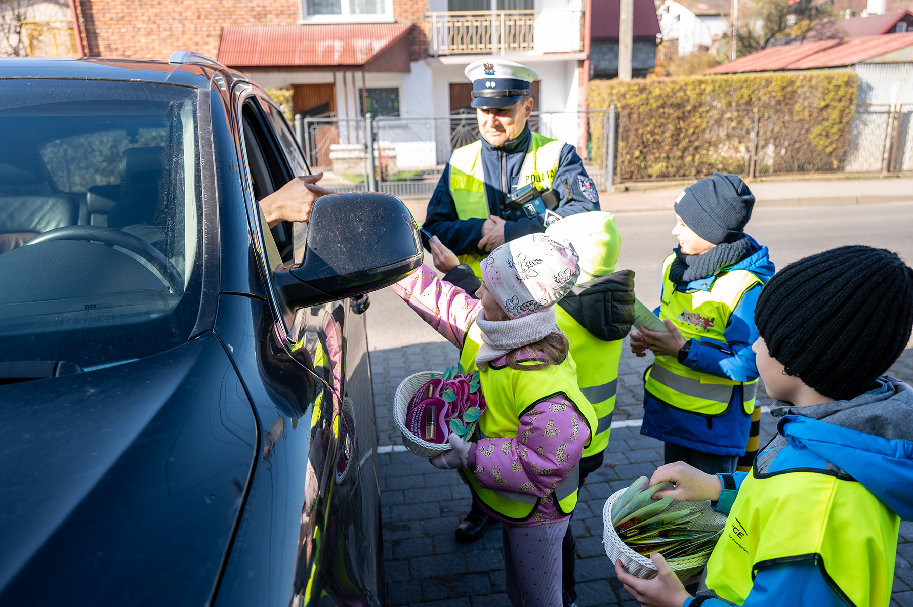Wspólnie z funkcjonariuszem zachęcali kierowców do odpowiedzialnego zachowania i dbałości o bezpieczeństwo wszystkich uczestników ruchu drogowego.