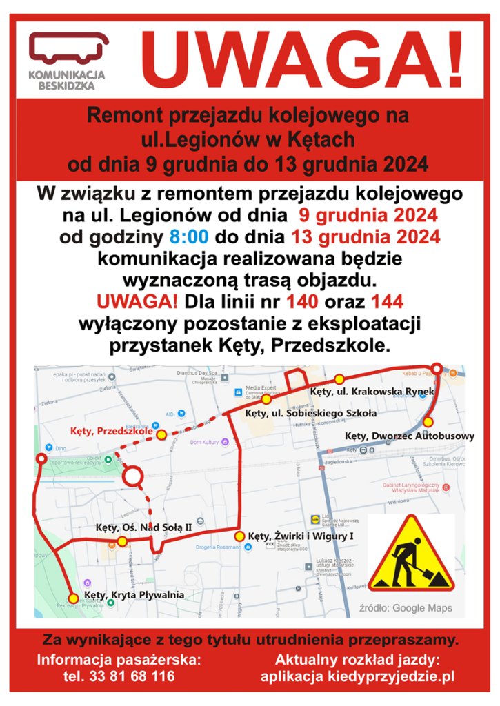W związku z remontem przejazdu kolejowego, przystanek Kęty Przedszkole zostanie czasowo wyłączony z obsługi dla linii 140 i 144. Autobusy tych linii będą kursowały zgodnie z wyznaczonymi trasami objazdowymi. Szczegółowy przebieg objazdu został przedstawiony na mapie dostępnej w komunikatach przewoźnika.